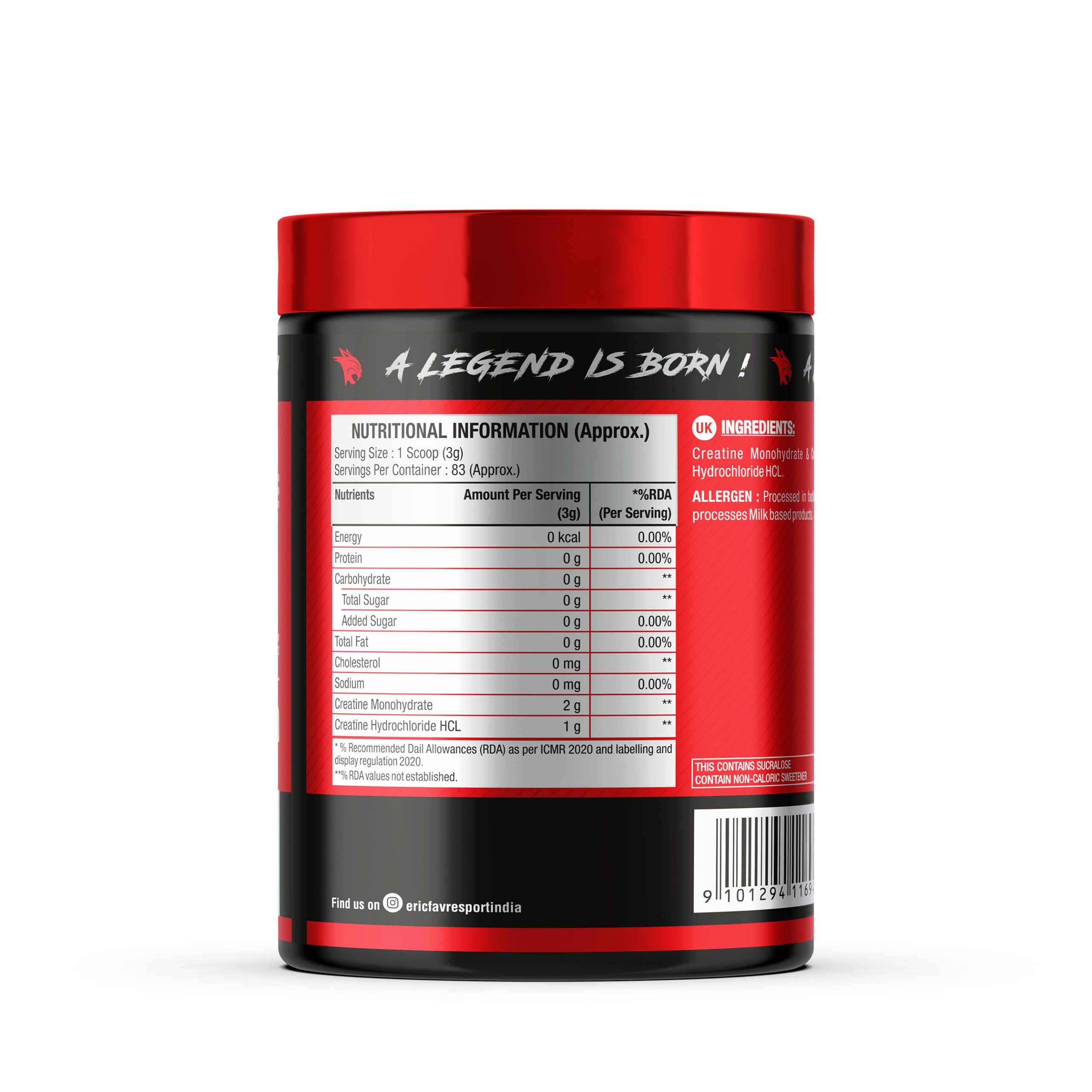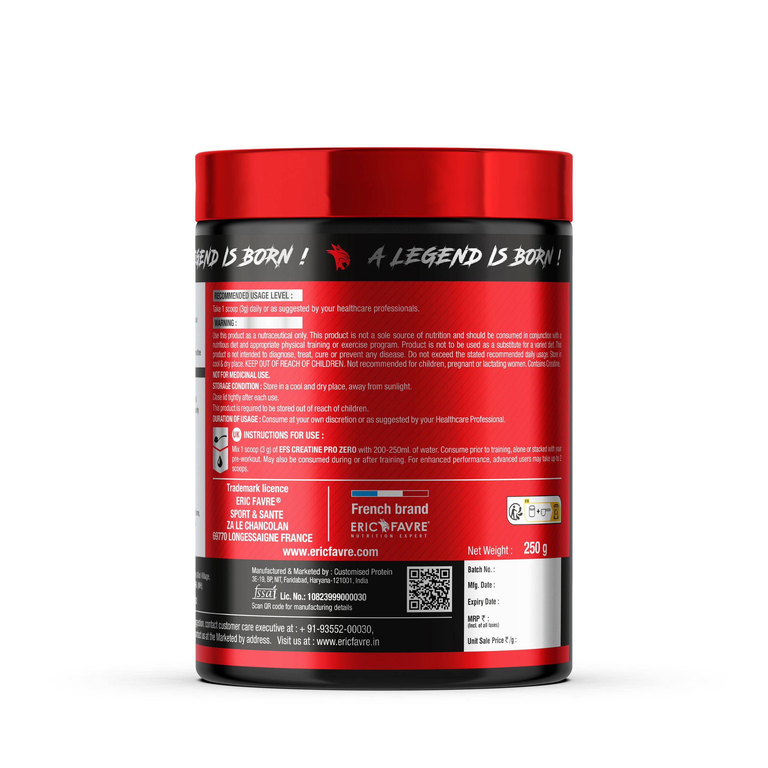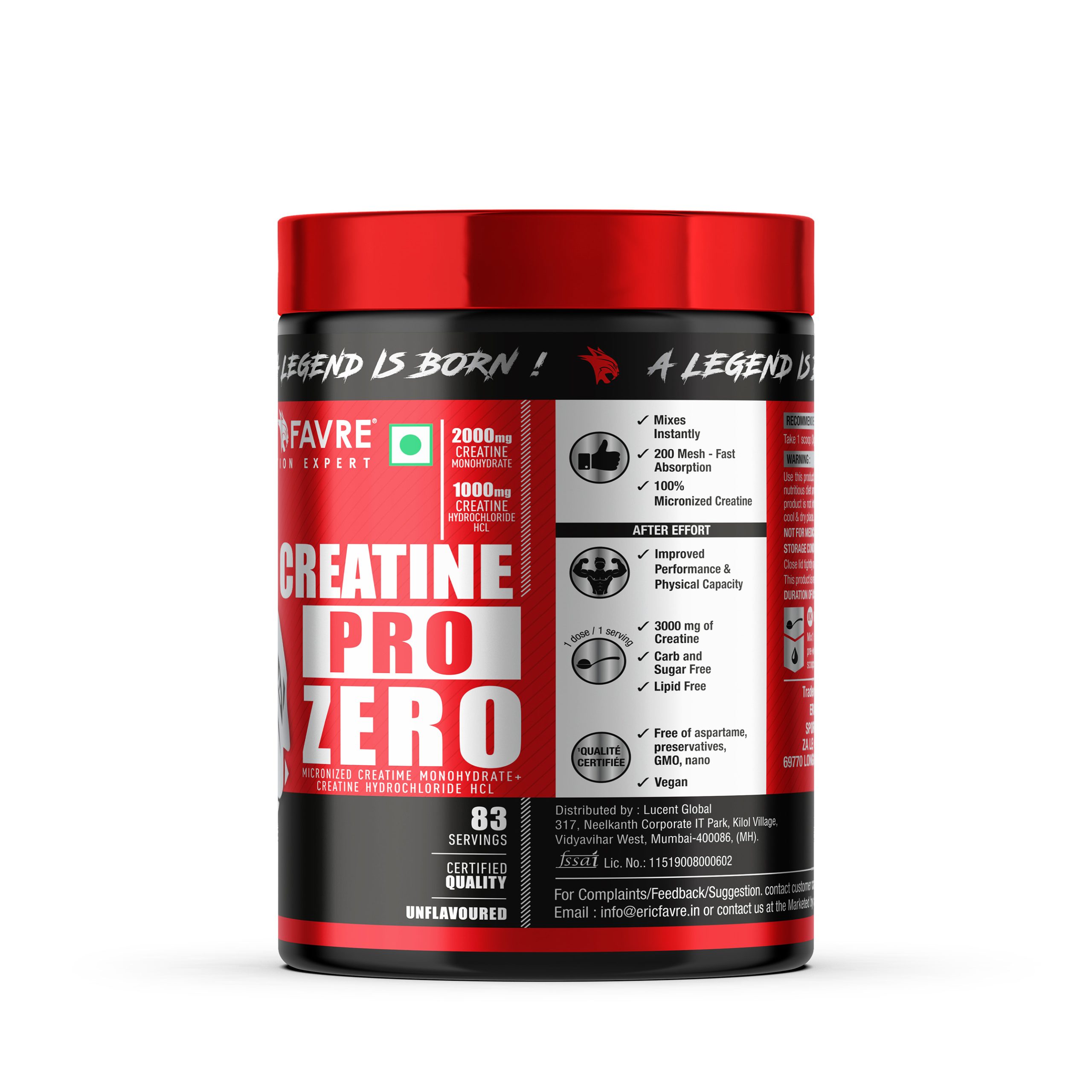 Dual-Source Creatine — 3g Per Serving for Strength & Performance. Creatine Pro Zero by Eric Favre is an unflavoured creatine blend designed to support strength , power , and training performance . Each scoop (3g) delivers 2g creatine monohydrate plus 1g creatine HCL , with zero sugar and zero calories—easy to mix into water, juice, or your shake. 3g creatine per serving (2g monohydrate + 1g HCL) 83 servings per container Unflavoured — mix with any drink Net weight: 250g Supports strength , performance , and muscle building