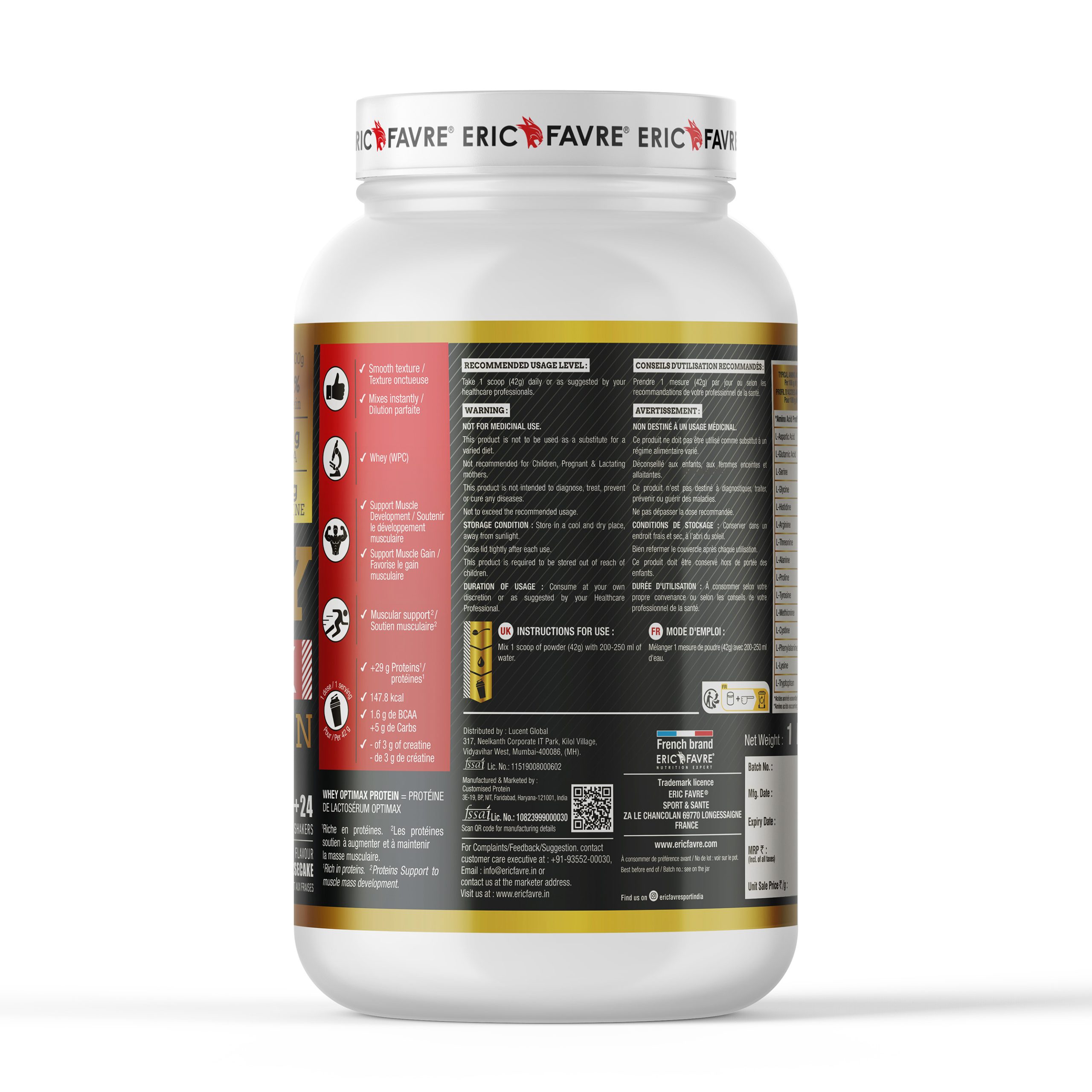 Build Muscle & Strength — 29g Protein + 3g Creatine Per Shake. Whey Optimax by Eric Favre combines high-quality whey with added creatine to support muscle growth , recovery , and strength gains . Each serving (42g) delivers 29g protein , 3g creatine , and 1.6g BCAA , with only 2g sugar —smooth mix, great taste. 29g protein per serving (42g) 3g creatine per serving 1.6g BCAA per serving Low sugar (2g) & easy digestion enzymes